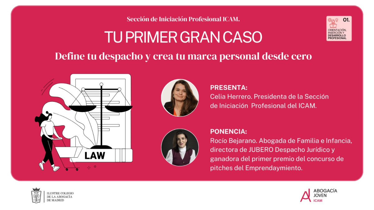 El próximo jueves 29 de enero, a las 19:00h., la Sección de Iniciación Profesional del ICAM ha organizado la jornada “TU PRIMER GRAN CASO: Define tu despacho y crea tu marca personal desde cero”, un encuentro diseñado para ofrecer a la abogacía joven las claves reales que necesita para lanzar su proyecto profesional y empezar a ejercer con seguridad y criterio propio.