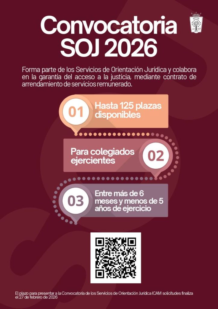 El Ilustre Colegio de la Abogacía de Madrid (ICAM) mantiene abierta, hasta el 27 de febrero de 2026, una nueva convocatoria para incorporar hasta 125 letrados y letradas a los Servicios de Orientación Jurídica (SOJ), prestados en colaboración con la Comunidad de Madrid, distintos ayuntamientos y otras instituciones.
